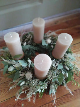 Du wickelst selbst unter Anleitung einen hübschen Adventskranz mit unterschiedlichem Tannengrün und Eukalyptus und verzierst ihn im Anschluss mit Trockenblumen weihnachtlichen Accessoires.