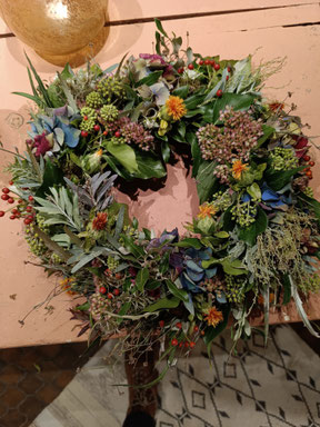 Du wickelst einen ganz natürlichen Türkranz (ca. 25 - 30 cm) mit vielen herbstlichen Elementen, Moos, Hortensie und einigen weiteren Naturmaterialien.