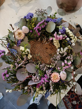 Du wickelst einen haltbaren Ring mit Trockenblumen (Durchm. 30 cm) mit frühlingsshaften und österlichen Materialien und weiteren Naturmaterialien.